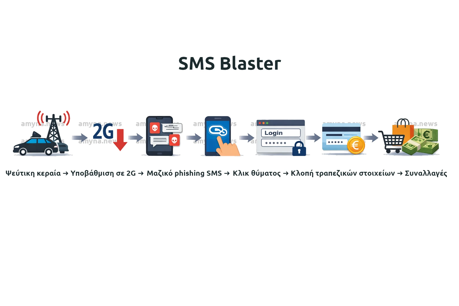 Η μέθοδος του SMS Blaster (γνωστή διεθνώς και ως IMSI Catcher ή False Base Station) είναι εξαιρετικά επικίνδυνη γιατί παρακάμπτει τις παραδοσιακές δικλείδες ασφαλείας των τηλεπικοινωνιακών παρόχων.