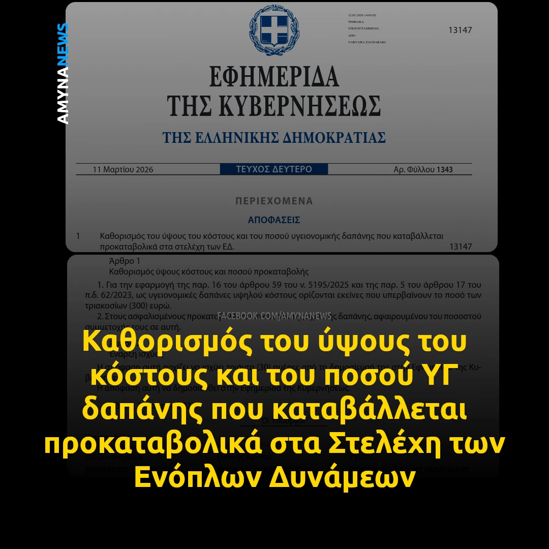 Δημοσεύθηκε στο ΦΕΚ 1343/11-3-2026 η Κοινή Υπουργική Απόφαση (ΚΥΑ) του Υπουργού Υγείας Άδωνι Γεωργιάδη, του Υφυπουργού Εθνικής Άμυνας Θανάση Δαβάκη και του Υφυπουργού Εθνικής Οικονομίας & Οικονομικών Θάνου Πετραλιά.