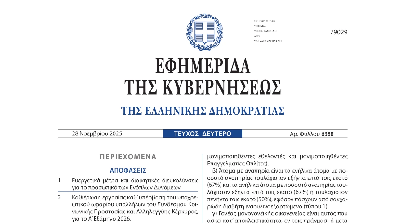 Δημοσιεύθηκε στο ΦΕΚ 6388/2025 η νέα Υπουργική Απόφαση με τα ευεργετικά μέτρα και διοικητικές διευκολύνσεις για το προσωπικό των Ενόπλων Δυνάμεων.