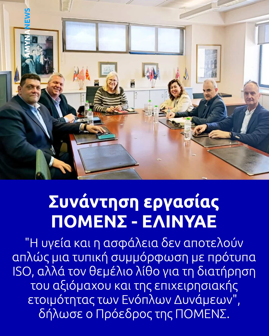 “Η συνάντηση πραγματοποιήθηκε σε κλίμα αμοιβαίας κατανόησης και επικεντρώθηκε σε κρίσιμα ζητήματα που αφορούν τη βελτίωση των συνθηκών εργασίας του στρατιωτικού προσωπικού, την παροχή επιστημονικής υποστήριξης και τεχνογνωσίας από την πλευρά του ΕΛΙΝΥΑΕ, καθώς και τη διοργάνωση κοινών σεμιναρίων και ενημερωτικών ημερίδων, με στόχο την καλλιέργεια κουλτούρας πρόληψης”, αναφέρει σε ανακοίνωσή της η ΠΟΜΕΝΣ.