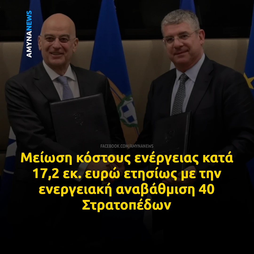 Προγραμματική συμφωνία που προσφέρει στις Ελληνικές Ένοπλες Δυνάμεις τη δυνατότητα της περαιτέρω ενεργειακής τους αναβάθμισης υπέγραψε ο Υπουργός Εθνικής Άμυνας Νίκος Δένδιας με τον Αντιπρόεδρο της Ευρωπαϊκής Τράπεζας Επενδύσεων (ΕΤΕπ) Ιωάννη Τσακίρη.
