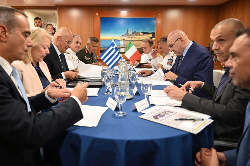 Ο ΥΕΘΑ Δένδιας, συνοδευόμενος από τον Αρχηγό ΓΕΝ Αντιναύαρχο Δημήτριο-Ελευθέριο Κατάρα ΠΝ, συναντήθηκε με τον Υπουργό Άμυνας της Ιταλίας Γκουΐντο Κροσέτο (Guido Crosetto) στη Φρεγάτα του Πολεμικού Ναυτικού της Ιταλίας F 598 ITS.