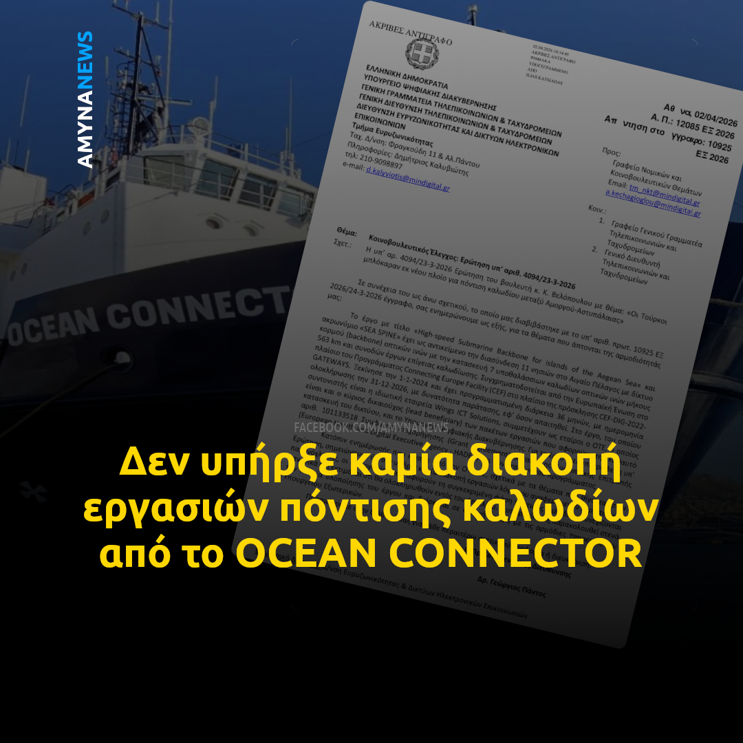 “Δεν υπήρξε καμία διακοπή εργασιών λόγω του αναφερόμενου περιστατικού παρενόχλησης, οι δε εργασίες που αφορούν τη συγκεκριμένη φάση πόντισης καλωδίων συνεχίζονται κανονικά και εκτιμάται ότι θα ολοκληρωθούν εντός του Απριλίου”, απάντησε το Υπουργείο Ψηφιακής Διακυβέρνησης σε Ερώτηση κοινοβουλευτικού ελέγχου με θέμα: “Οι Τούρκοι μπλόκαραν εκ νέου πλοίο για πόντιση καλωδίου μεταξύ Αμοργού-Αστυπάλαιας”.