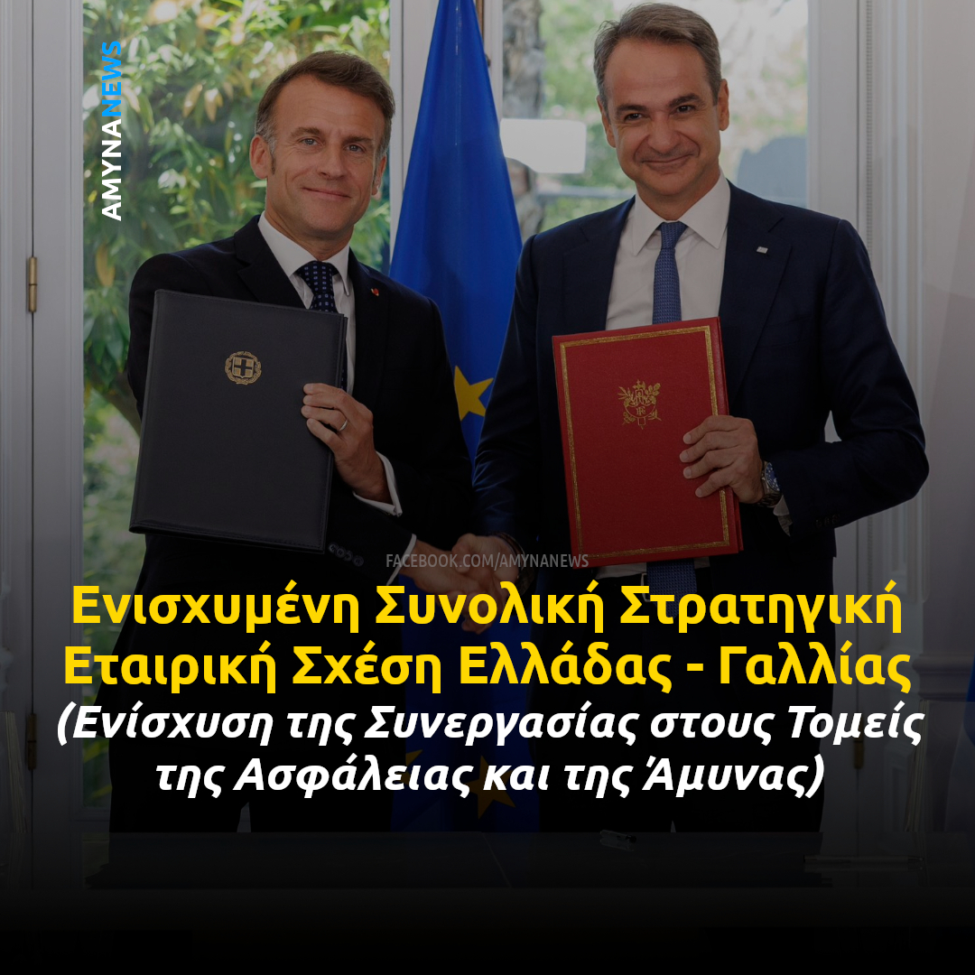 Ο Πρωθυπουργός Κυριάκος Μητσοτάκης και ο Πρόεδρος της Γαλλικής Δημοκρατίας Εμανουέλ Μακρόν (Emmanuel Macron) υπέγραψαν την Ενισχυμένη Συνολική Στρατηγική Εταιρική Σχέση μεταξύ Γαλλίας και Ελλάδας.