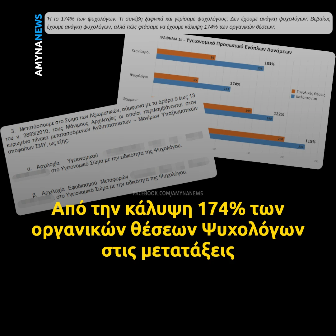 “Ή το 174% των ψυχολόγων. Τι συνέβη ξαφνικά και γεμίσαμε ψυχολόγους; Δεν έχουμε ανάγκη ψυχολόγων; Βεβαίως έχουμε ανάγκη ψυχολόγων, αλλά πώς φτάσαμε να έχουμε κάλυψη 174% των οργανικών θέσεων;”