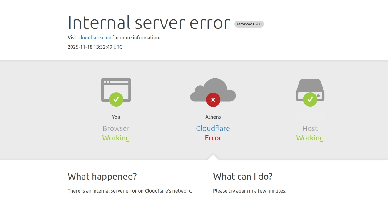 Οι χρήστες όταν επισκέπτονται ελληνικές ιστοσελίδες βλέπουν το μήνυμα :”Internal server error. Error code 500. Visit cloudflare.com for more information.“